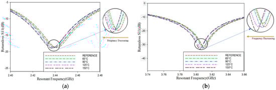 As the temperature surrounding the patch antenna increased from 30 °C to 150 °C, the resonant frequency exhibited a trend in decrease at both 2.4 GHz and 3.8 GHz. Figure 3a,b illustrate the return loss of the patch antenna, highlighting the shift in response to frequency changes caused by temperature fluctuations. Specifically, the frequency shift at 2.44 GHz primarily reflected changes in the length (ΔL) of the patch, whereas the shift at 3.81 GHz predominantly corresponded to changes in the width (ΔW).