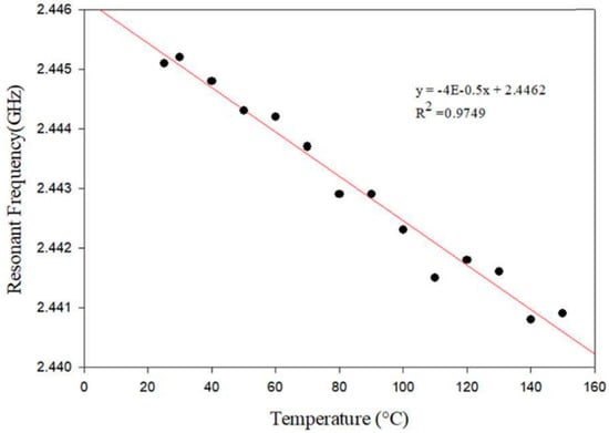 The same analysis is carried out over the width of the patch. The first resonance of the patch shows a sensitivity of 0.04 MHz/°C and the second resonance shows a sensitivity of 0.06 MHz/°C. This provides an R2 = 0.932 from the experiment during the first resonance characterization. The results obtained experimentally are in good agreement with the simulated ones.