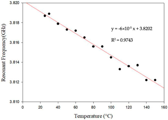 Similarly to the observations in Figure 4, Figure 5 also demonstrates a negative correlation between temperature and frequency at 3.8 GHz. The measured 3.8 GHz frequency reflects variations attributed to changes in the antenna’s length dimension. It is pertinent to note that the data presented in the graph are confined to a limited temperature range, spanning from 30 °C to 150 °C, corresponding to a frequency range of 3.8042 GHz to 3.8107 GHz. Within this range, sensitivity can be calculated as the change in frequency per unit degree Celsius, computed as 0.6 MHz. Moreover, the graph facilitates the determination of the correlation coefficient (R), which registers at 0.9743 at 3.8 GHz.
