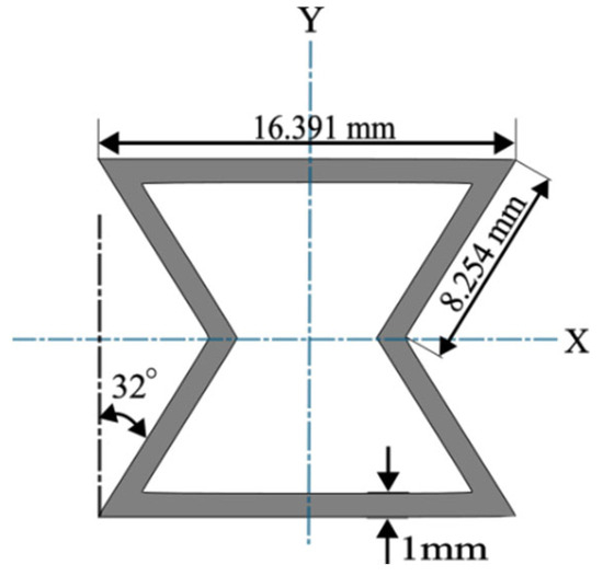 The modeling of the honeycomb beam and the oriented re-entrant structures (ORS) is performed using ABAQUS 6.14. The unit cell structure of re-entrant honeycomb is constructed as shown in Figure 1, with a cell angle of 32° and a rib thickness of 1 mm. The horizontal length and slant length are 16.39 mm and 8.25 mm, respectively. These replicated cells constitute a cluster of auxetic structures within a frame as shown in Figure 2