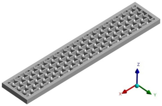 The re-entrant beams are designed with orientation angles of 0° (ORS0), 45° (ORS45) and 90° (ORS90), as seen in Figure 3. The ultimate configurations of ORS0, ORS45, and ORS90 are obtained by rotating a cluster of re-entrant cells at the respective angles and positioning it within a bounded frame measuring 326 mm in length, 64 mm in width, and 6 mm in thickness. The depth of the structures is 10 mm each. The dimensions are set as the same for all the beams to maintain uniformity and avoid errors.