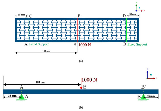 A force of 1000 N is applied along the center line of all the beams at EF, as shown in Figure 5. The force is exerted in the direction of negative z-axis. Fixed supports are provided along the beams at two lines AC and BD, both 35 mm apart from each of the respective ends, as shown in Figure 5.