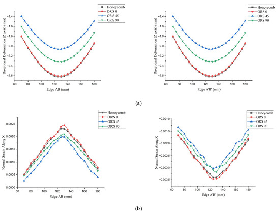Structural characteristics plotted against edges AB and A′B′. (a) Directional deformation along z-axis. (b) Normal strain along x-axis.