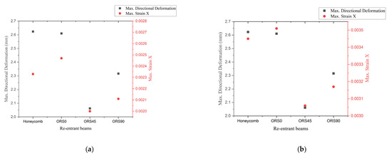In Figure 6a,b, the honeycomb beam exhibits behaviors very close to that of an ORS0 beam. The homogeneous beam shows very significant variation from the remaining re-entrant beams. It gives small values for deformation and strains.