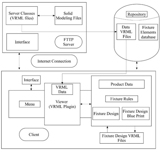 The system utilizes Java for programming, Java 3D for graphics API, and VRML for information exchange file format to ensure interoperability across different operating platforms. The system’s architecture, as seen in Figure 1, is called an FTTP Server architecture. This architecture divides programme execution into client and server. Clients handle user input and 3D model display. The server processes modelling and the repository stores fixture element data.