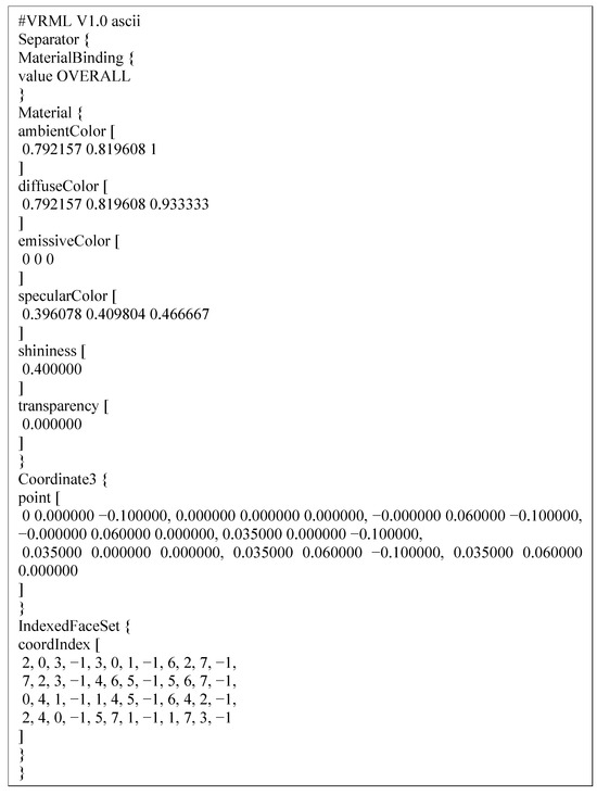 The WRL file is used for visualization purposes, and it contains information about the many aspects of the polygonized model of workpieces and fixture elements. Figure 2 illustrates the VRML plugin layout displayed by the system. Before describing data using VRML, a document type (DTD) description must first be specified. As a result, the data structure included within the VRML file can be regulated. There is a hierarchical structure to which XML tags all adhere. The root tag is consistently identified as <DOCUMENT> regarding VRML files. Within the WRL schema, every individual identified by a <BODYTAG> is further segmented into numerous faces. The <FACETAG> is employed to identify the various surfaces of the human body. The feature known as <FACETYPE> provides information regarding the shape of the face, including cylindrical, planar, or spherical characteristics. The corners of every face are represented by the icon <SNAPPOINT>. Facets, defined as elemental triangles, further subdivide each cup. Every triangle’s vertices are represented by their coordinates, which are included in the <FACET> tag.
