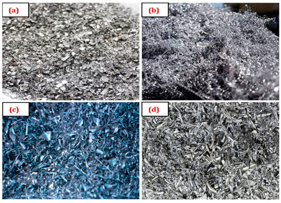 Raw materials (chips) of (a) Ti, (b) Al, (c) Cr, and (d) Nb alloys.
