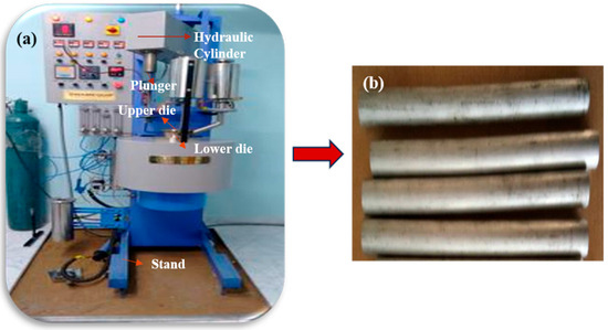 Schematic representation of (a) squeeze casting equipment and (b) casting samples.