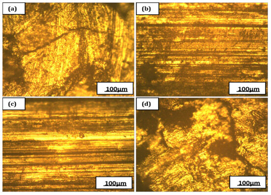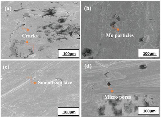 Figure 4a–d displays the optical microstructure images of the unreinforced alloy and hybrid composites. Figure 4a illustrates the fissures and more prominent channels present on the surface of the base alloy. Initially, the MoS2 particles have a much higher melting point than the material. As a result, they become partly embedded in the base material and appear as small plate-shaped structures. When the wt.% of reinforcing particles increases, and later, it decreases, the presence of surface grooves, which serve as lubricants to enhance the mechanical properties. The matrix phase is characterized by an Al/Ti/Cr composition and contains Nb particles with a small, plate-like shape. In contrast, the secondary phase consists of MoS2 particles with a spherical shape. The grain size has decreased, resulting in a significant improvement in mechanical properties. However, no MoS2 particle clustering was observed in the combination, as revealed by backscattered electron microscopy. Zang et al. [15] prepared a hybrid composite material through a squeeze casting process using Ti–Al alloy as the matrix with Al2O3 and MoS2 as reinforcements. However, the material strength of the composite improved due to the presence of MoS2, whereas the smooth surface appears up to 3% of reinforcement particles. Figure 4c reveals a uniform mixture in addition to 4% MoS2 particles to the base alloy, which tends to have a smooth surface. However, small cracks are identified, increasing 6% MoS2 particles, as shown in Figure 4d.