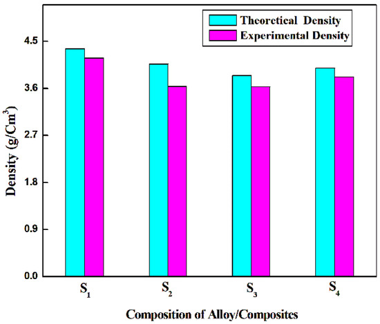 The theoretical density of the composites was determined using the law of mixtures from Equation (1). Figure 6 displays the comparison between theoretical and measured density. The theoretical densities of the base alloy are higher (4.36 g/cm3) than the density of the hybrid composites. The density value of the sample (S2) is 3.85 g/cm3, and adding the MoS2 reinforcement in the matrix phase decreased the experimental density of composites by up to 4% (3.70 g/cm3) due to uniform distribution between particles [19]. As the concentration of particles increases, the matrix–particle interface strengthens, which enhances the particles’ tendency to aggregate. Incorporating 6% MoS2 particles deteriorates their bonding abilities, resulting in a lower measured density of 3.82 g/cm3 compared to the theoretical density.
