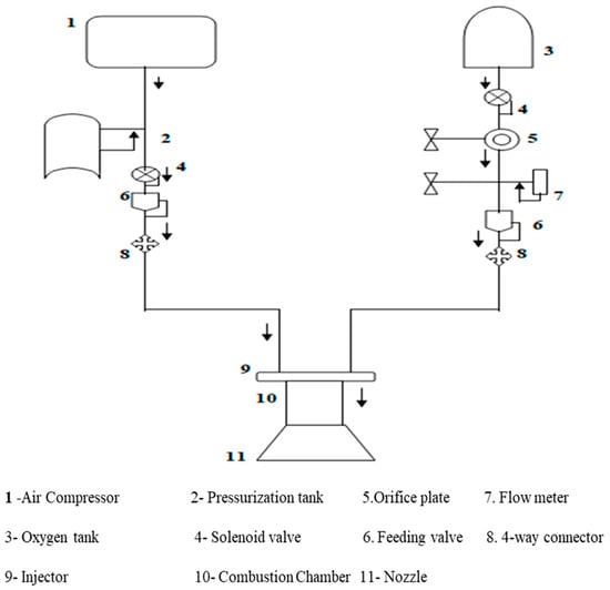 A pressure regulator was connected to the oxygen cylinder using a 10,000 psi, 3-m-long hosepipe connected to the oxygen mass flow meter and the orifice plate. A solenoid valve was connected to control the flow of oxygen. On the other end, an air compressor was used to compress and pressurize the fuel to flow into the injector, which was connected using a hose pipe and an orifice plate to the inlet of the chamber.