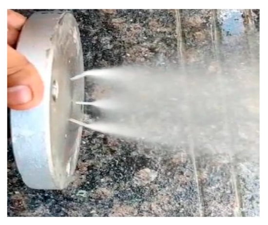 The unlike doublet injector was tested using water and oxygen pumping through their respective injector holes to check whether the atomization was proper or not. The flow rates of water and oxygen were also found during this testing (Figure 3). The flow rate of water was 0.02 kg/min and the flow rate of oxygen was 0.3 kg/min (Table 7).