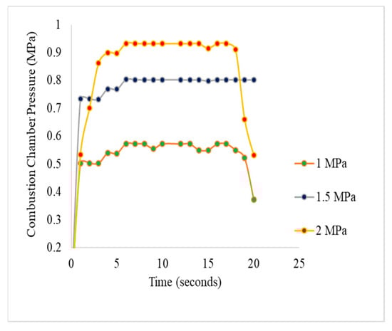 Between 0 and 20 s of fuel burn, pressure readings within the combustion chamber were meticulously tracked and documented. The critical phases of the motor test firing—the ramp-up, steady state, and cut-off stages—were closely observed as depicted in Figure 4. There was a slight decline in chamber pressure throughout firing, which became more pronounced with higher oxidizer mass flow rates.