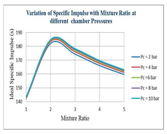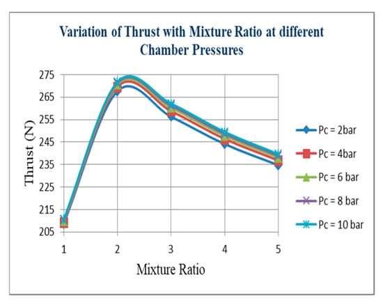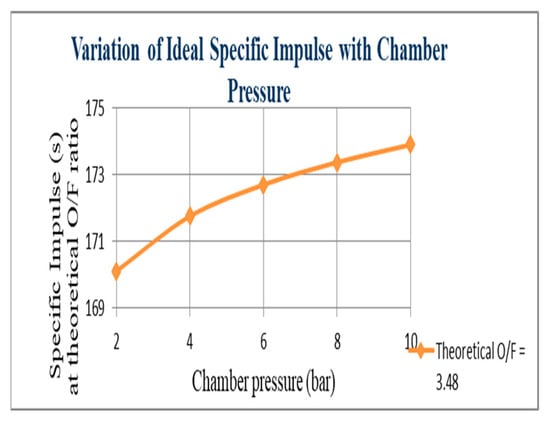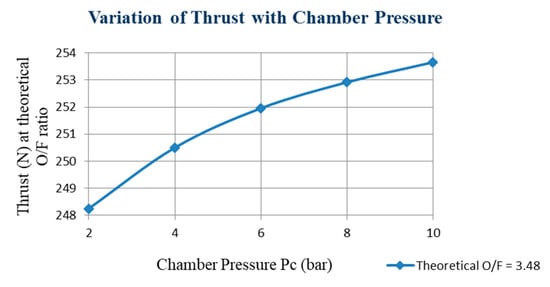 Figure 8 indicates that at point 3.12, the maximum exit temperature can be achieved. After that point, the nozzle exit temperature will decrease negligibly with regard to the mixture (O/F) ratio for all chamber pressure values. From Figure 9, the variations of thrust with mixture (O/F) ratio indicate that at point 2.345, the maximum thrust can be achieved. The variation of the ideal specific impulse with chamber pressure delineates that the specific impulse will increase with increasing pressure. However, the difference between two specific impulse values at chamber pressures 4 and 10 was negligible. A significant chamber pressure can affect combustion efficiency so the expected specific impulse value can be achieved at the determined chamber pressure. (Figure 10). The variation of characteristic velocity with chamber pressure (Figure 11) delineates increasing the pressure; the characteristic velocity also increases. However, the difference between the two characteristic velocity values at chamber pressures 4 and 10 is negligible. A significant chamber pressure can affect combustion efficiency so that the expected characteristic velocity value can be achieved at the determined chamber pressure. The variation of thrust with chamber pressure (Figure 12) delineates that increasing the thrust pressure will also increase. However, the difference between two thrust values at chamber pressures 4 and 10 is negligible. A significant chamber pressure value can affect combustion efficiency to determine the expected thrust value at the determined chamber pressure.