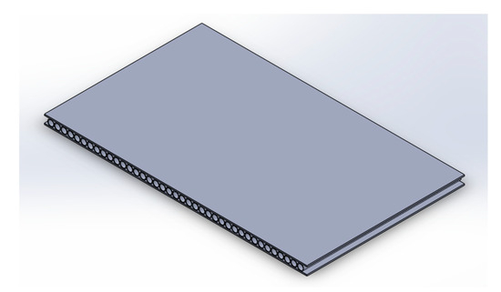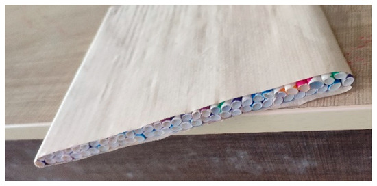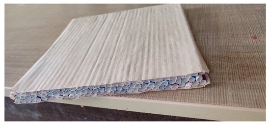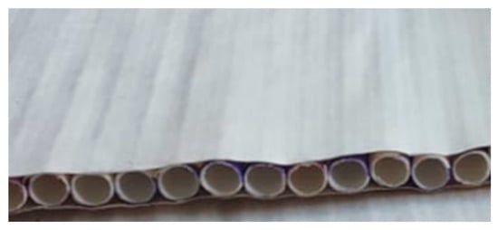 A single layer of cylinders was pasted on a kraft paper sheet of thickness 1 mm. The overall length and breadth of the model turned out to be 198 mm and 160 mm, respectively, with a thickness of 5 mm. A maximum compressive load of 5.6 kN was tolerable and after deformation, the thickness was 4.8 mm (shown in Figure 7).