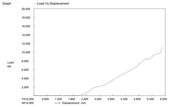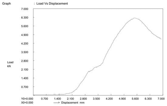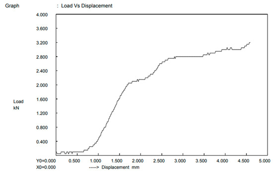 The real model went through a compression testing machine with a dimension of 5 mm. The load was applied gradually to the one-layer model. It could withstand up to 5.6 kN. After compression, it was slightly deformed. The dimension after undergoing compression was 4.8 mm, and the readings were graphed and are shown in Figure 11.