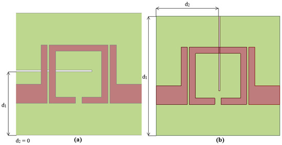 The origin of the crack is assumed to be located at a distance d1 = 10 mm along the Y axis with location along X axis being at d2 = 0, as seen in Figure 3a. In the initial analysis, the length of crack is increased along the X- axis with the length increasing from 4 mm to 18 mm going through the sensor, thus perturbing the field distribution relative to the uncracked sensor, as seen in Figure 4a,b, which also changes the resonant frequency of the sensor.