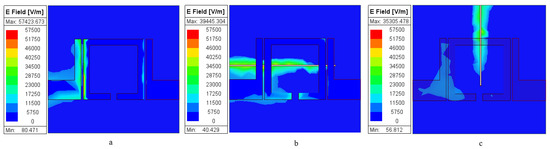 Figure 4. Electric field distribution for with (a) Sensor without crack (b) Sensor with crack along length of sensor (c) Sensor with crack along width of sensor.