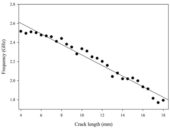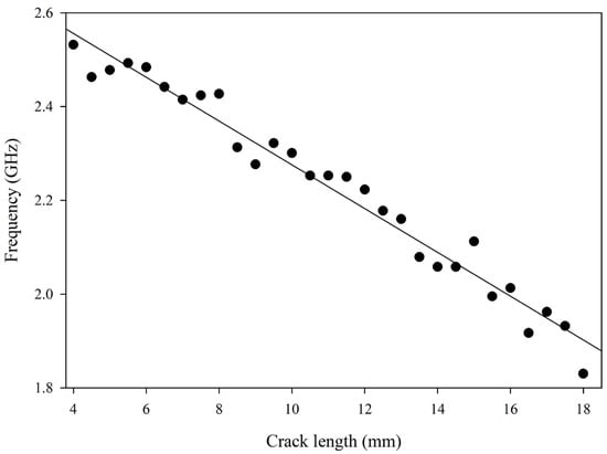 The frequency response at Lc = 2 mm is 2.472 GHz which falls to 1.83 GHz for a crack length of 18 mm. The total drop in frequency from the original design without a crack is thus 664 MHz, which corresponds to a fall in frequency of nearly 36 MHz for every millimeter of crack length.