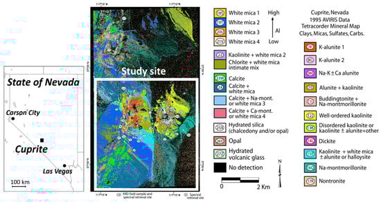 - Swayze, G.A.; Clark, R.N.; Goetz, A.F.H.; Livo, K.E.; Breit, G.N.; Kruse, F.A.; Sutley, S.J.; Snee, L.W.; Lowers, H.A.; Post, J.L.; et al. Mapping Advanced Argillic Alteration at Cuprite, Nevada Using Imaging Spectroscopy. Econ. Geol. 2014, 109, 1179–1221. [Google Scholar] [CrossRef]