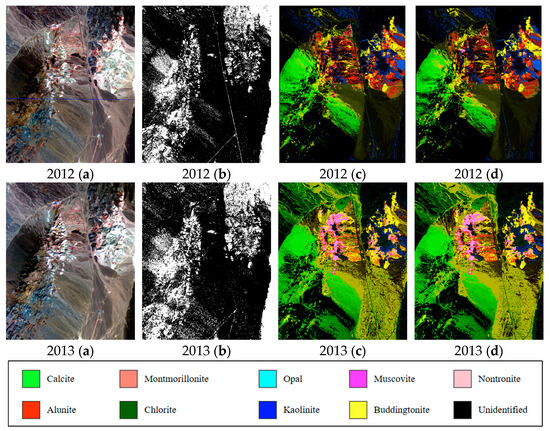 Figure 3, a visual comparison of the mineral maps generated for 2011, 2012, and 2013 indicates that the maps produced by the proposed method exhibit greater spatial consistency in mineral distributions across the different years compared to those generated by the simple Tetracorder-based method, particularly for kaolinite located in the central-right regions of each map.