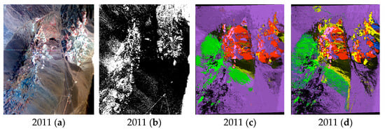 Maps obtained from the AVIRIS images acquired over the Cuprite site in 2011, 2012, and 2013: (a) true visible color image (RGB = band 27 (646.7 nm), band 17 (547.6 nm), band 7 (449.1 nm)), (b) pixels extracted by the PPI analysis, (c) mineral map of the simple Tetracorder-based map, and (d) mineral map of the proposed method.