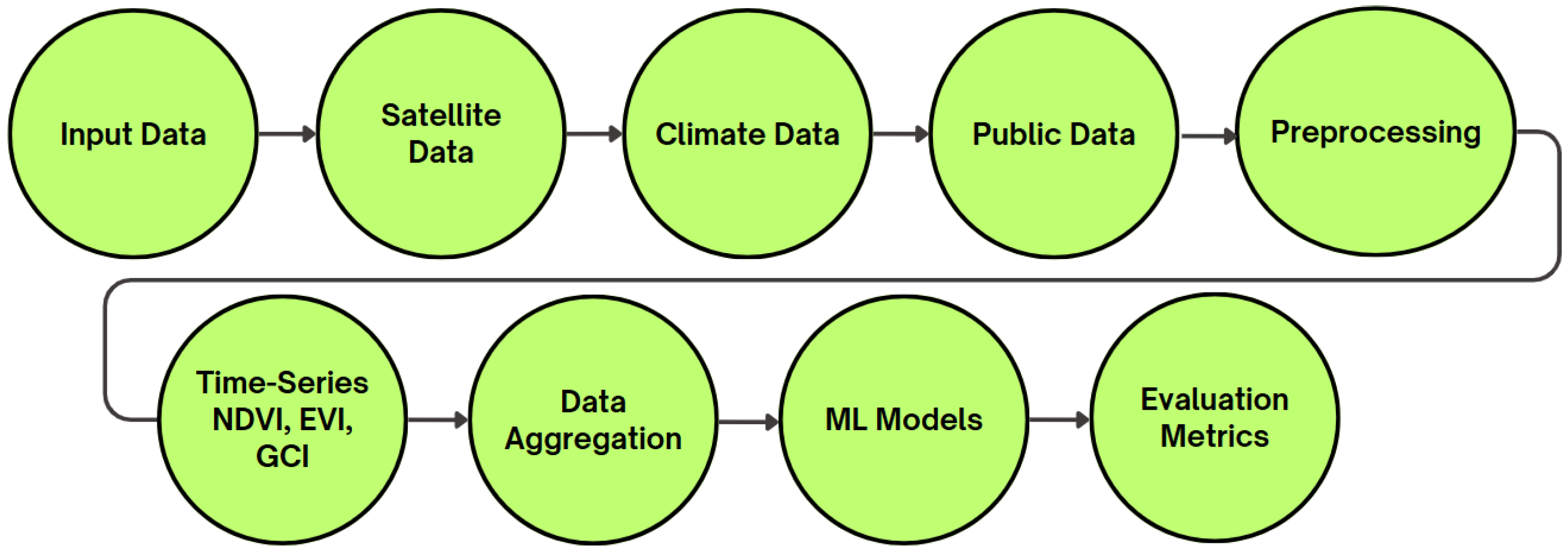 17]. These satellite-derived metrics are then aggregated and aligned with public datasets, such as administrative boundaries, reported yields, and land use information. The integrated dataset is subsequently prepared for machine learning, including feature engineering, model training, and performance evaluation, supporting data-driven decision-making in agricultural monitoring.