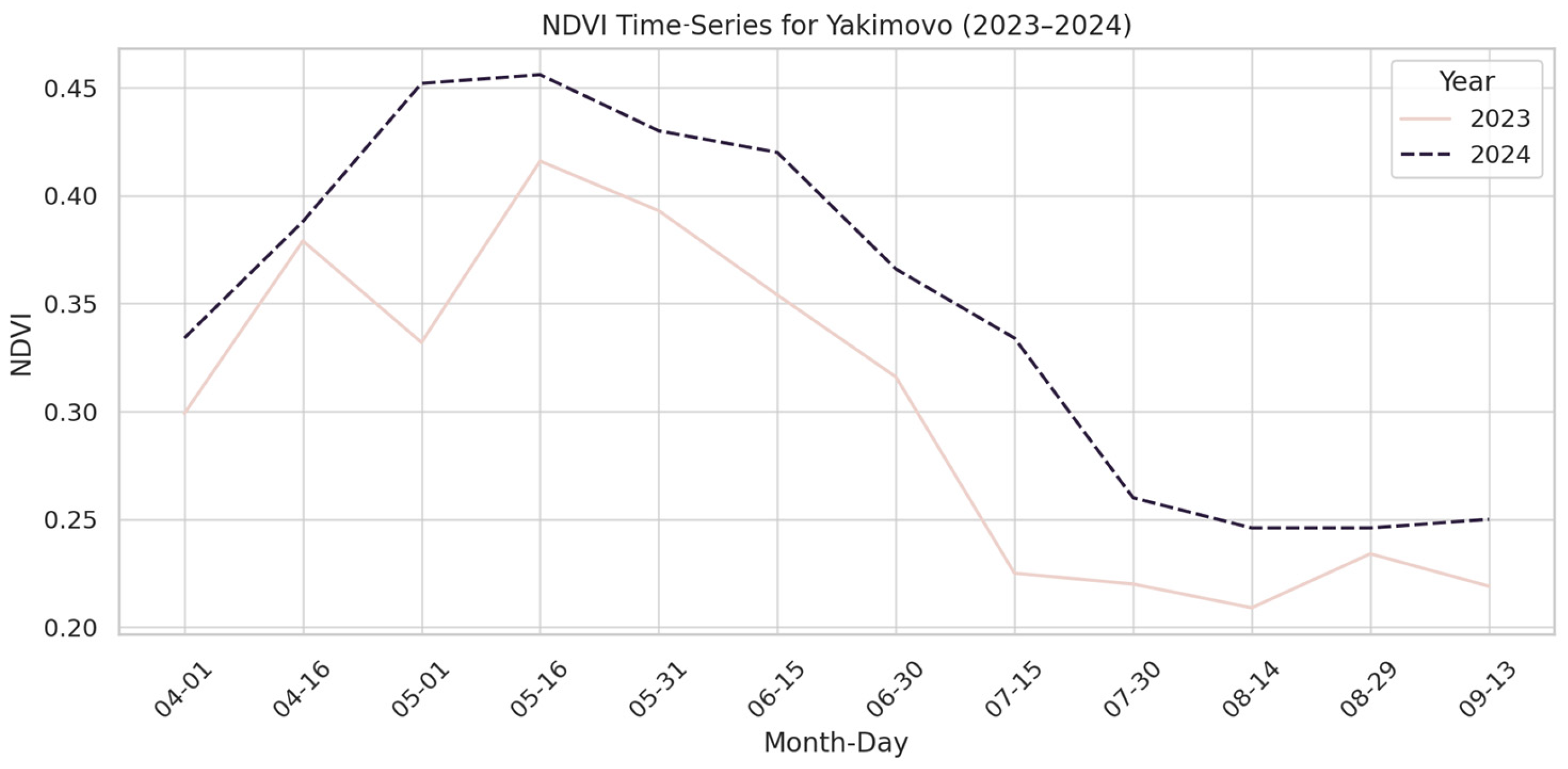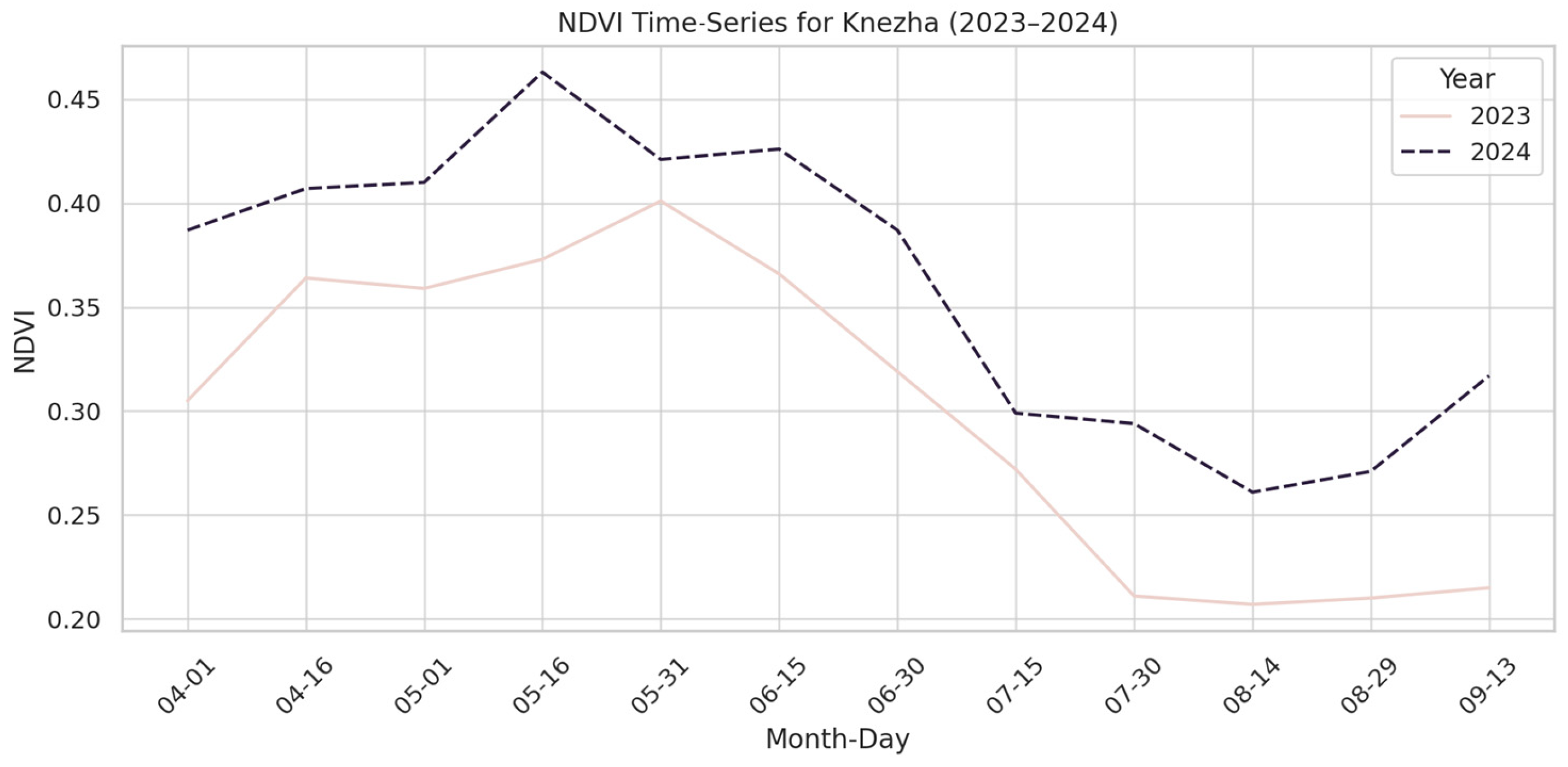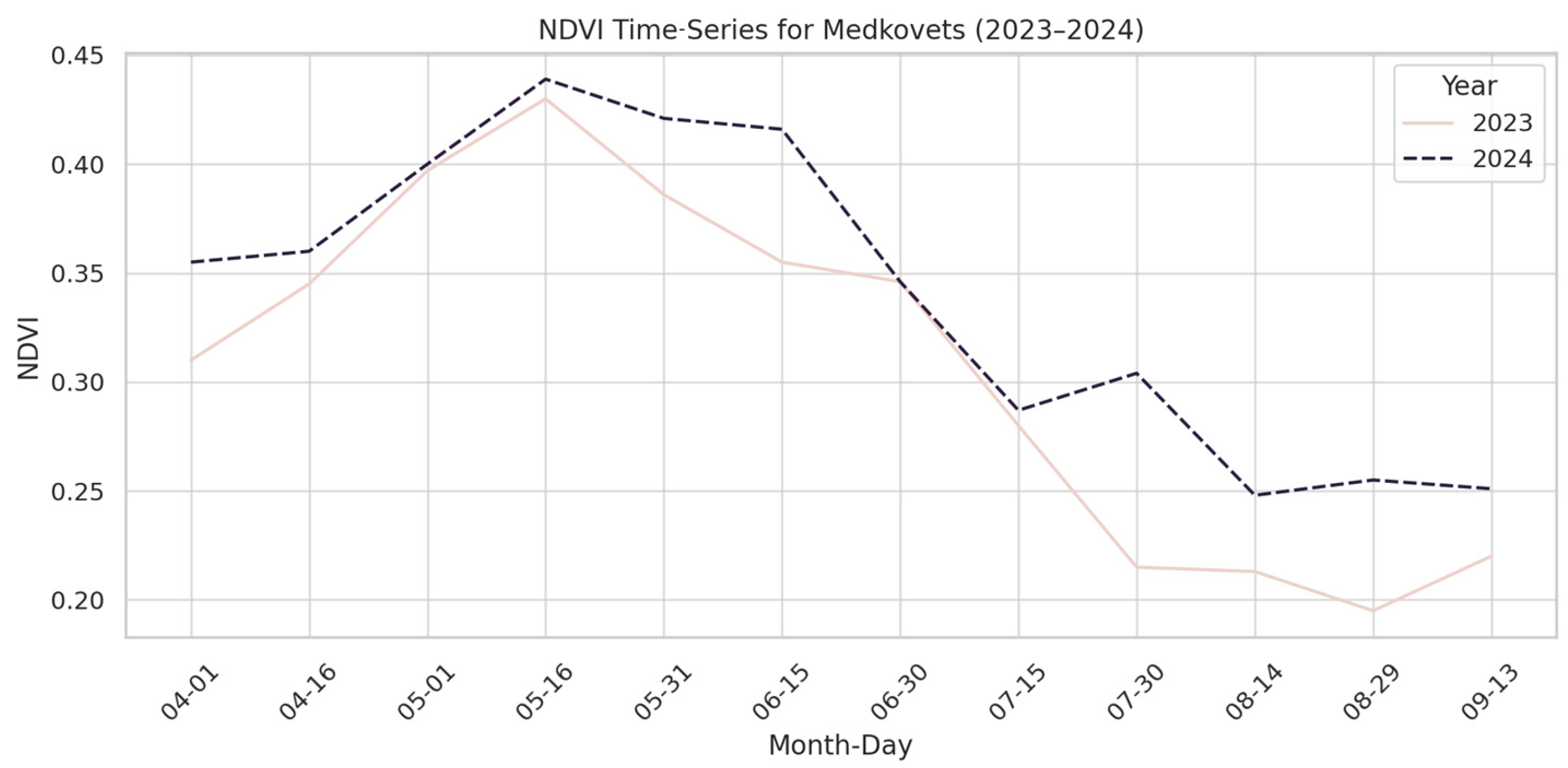 Vegetation indices were calculated for each scene and aggregated by municipality and cluster group. The data were normalized across years using calendar-day alignment to ensure comparability. The final dataset consisted of 15-day time-series profiles for the NDVI, EVI, and GCI for each municipality and cluster for both 2023 and 2024.