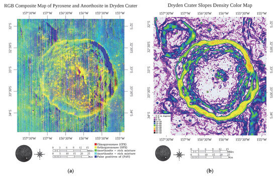 Maps in the mean earth/polar axis coordinate system. (a) RGB composite map of pyroxenes and anorthosite in Dryden; (b) Dryden Crater slope density color map.