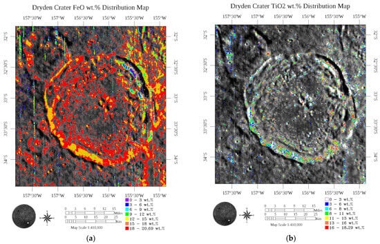 (a) Dryden crater FeO wt.% distribution map; (b) Dryden crater TiO2 wt.% distribution map.