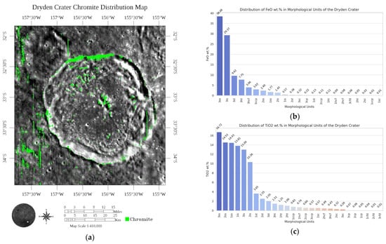 (a) Dryden crater chromite distribution map; (b) Distribution of FeO wt.% in morphological units of the Dryden crater; (c) Distribution of TiO2 wt.% in morphological units of the Dryden crater.