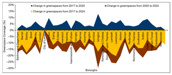 The assessment of green spaces shown in Figure 2 reveal a prominent decline between 2017 and 2024. The methodology adopted here suggests that more than 50 percent of boroughs have seen a decline of approximately 10–20 percent in green space during these years, and the average decline in green space for all the boroughs of London and the City of London is approximately 11 percent.
