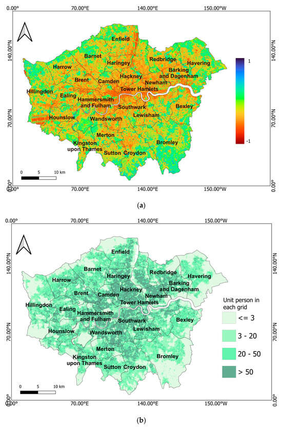 Despite London’s relatively high green cover, the report from the London Environment Strategy (2018) reported recent losses in green cover spaces due to new infrastructure developments such as housing, industries, schools, and transport [31]. The current study outcomes support the recent losses and indicate spatial differences in green spaces and green space exposure to residents of the neighbourhood in London and highlight the need to develop a strategy for the protection and enhancement of London GI. However, there are several noticeable limitations. First, these images do not consider the phenology and other characteristics of GI in complex urban environments. Second, the measurements allocate equal green spaces to a population irrespective of their accessibility. Third, the analytical outcomes for different boroughs could be influenced by the spatial aggregation and resampling techniques used to harmonise the datasets, which sometimes smooth out the finer spatial details. Additionally, it is believed that the green space exposure also varies due to geographical heterogeneity and regional weather patterns. Further, the spatial distribution of green spaces is also influenced by urbanisation patterns, master plans, and funding opportunities.