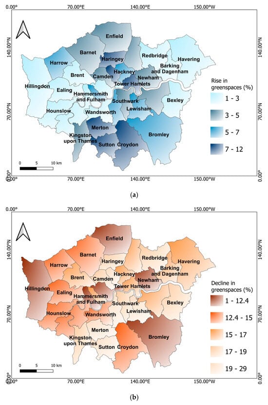 Spatial distribution of change in green spaces: (a) Between 2017 and 2020, there was an average increase in green cover of ~5% across all boroughs. (b) Between 2020 and 2024, there was an average decline in green cover of ~11% across all boroughs.