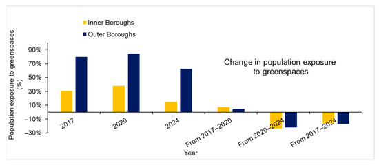 Population exposure to green spaces for inner and outer boroughs of London for the years 2017, 2020, and 2024. The graph also shows the change in green spaces between 2017 and 2020, 2020 and 2024, and 2017 and 2024.