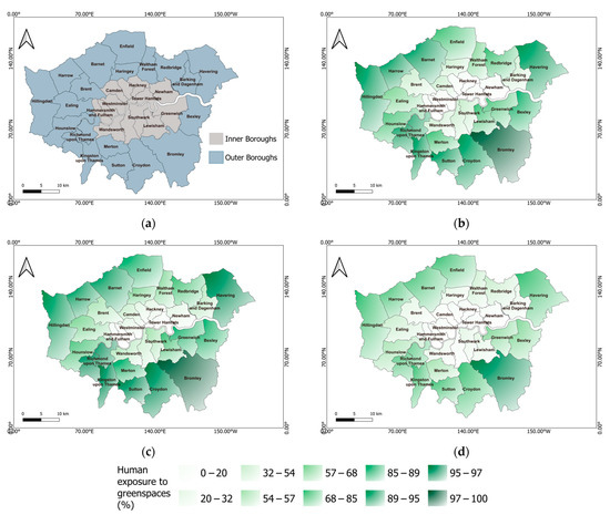 (a) Inner and outer Boroughs of London, and Borough-level assessment of human exposure to green spaces using satellite-derived vegetation index and population data, with darker colours indicating higher levels of green space exposure; (b) 2017, (c) 2020, and (d) 2024.
