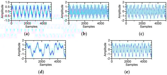 Figure 1. Simulated vibration signals: (a) healthy, (b) inner race fault, (c) outer race fault, (d) ball fault, (e) cage fault.