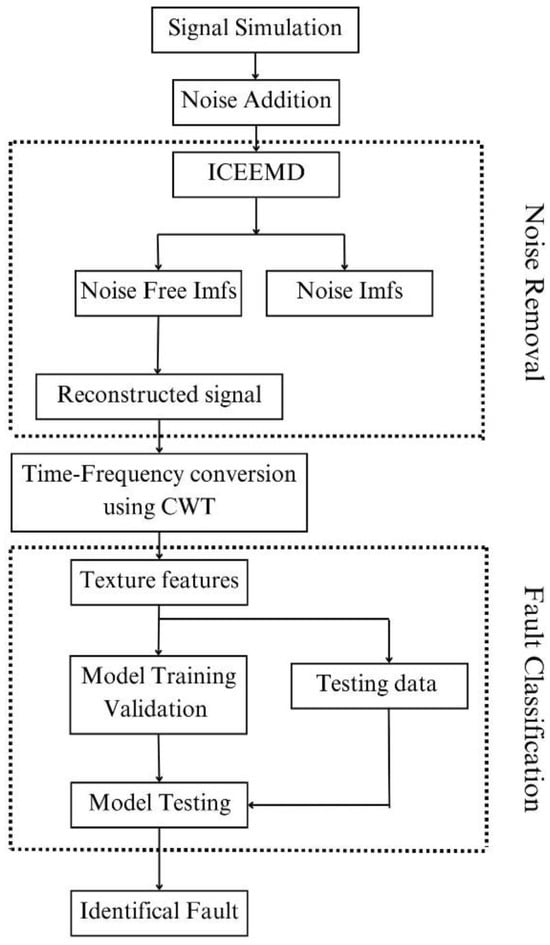 The proposed methodology of the work is shown in Figure 2. The overall process is carried out in five stages: signal simulation, noise removal, TF conversation using CWT, texture feature extraction, and fault classification. The various stages are detailed below.