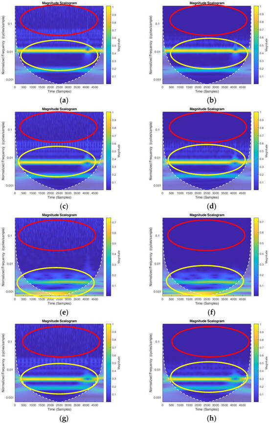 Figure 3. CWT distribution of the (a) inner race fault without ICEEMD (b) and with ICEEMD (c), outer race fault without ICEEMD (d) and with ICEEMD (e), ball fault without ICEEMD (f) and with ICEEMD (g), and cage fault without ICEEMD (h) and with ICEEMD.