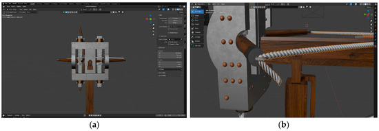 In Blender, a material defines the physical and optical characteristics of an object, controlling how it interacts with light and how it appears within a scene. The main properties of a material include reflectivity, transparency, roughness, and its composition. Textures, on the other hand, are 2D images applied to the surfaces of a 3D model, enriching its visual detail and simulating features like wood grain, stone irregularities, or reflection on a metal surface [22]. In this phase of the project, the focus is on optimizing the textures and materials of the scorpion’s 3D model to accurately replicate the original materials, such as wood, metal and rope, as illustrated in Figure 2.