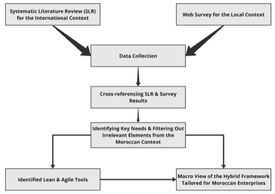 The research methodology presents a clear picture of the method adopted in this study (Figure 1), using an approach that mixes theoretical [] and local information []. The methodology began with a systematic literature review to identify existing project management frameworks in the international context, with a focus on Lean and Agile tools and their applications across various sectors. The review demonstrated a huge gap in the existence of frameworks specifically designed to overcome the challenges encountered by Moroccan organizations.