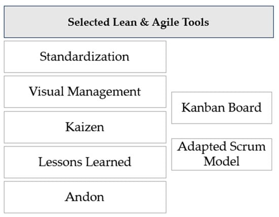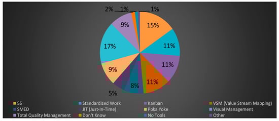 Our literature review highlights that several Lean tools are frequently referenced in project management research []. Standardization (15%), Kanban (13%), Visual Management (13%), and Kaizen (8%) are among the most commonly cited tools in existing studies []. These tools are widely acknowledged for their contribution to improving efficiency, reducing waste, and enhancing collaboration in project environments.