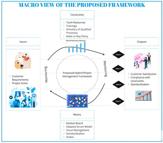 At the macro level, the framework is based on the Lean and Agile tools shown in Figure 5 to drive efficiency and adaptability. These include Kanban boards for workflow visualization, the Scrum model adapted for customized Agile implementation, Standardization for consistency of processes, Andon for real-time problem identification, and Visual Management for enhanced transparency. These tools allow teams to manage tasks efficiently while maintaining flexibility. The results expected from the framework comprise improved customer satisfaction, adherence to constraints, and enhanced standardization between projects. This hybrid approach, based on flexibility and step-by-step decision-making, ensures better project management while adapting to changing demand.