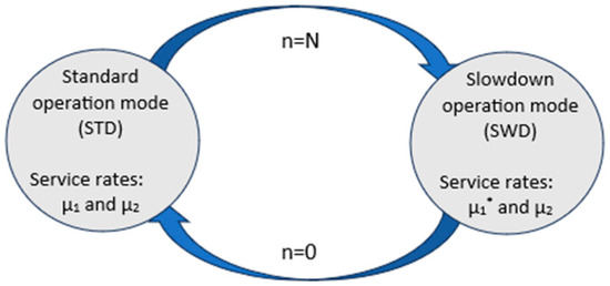 To improve system efficiency, Nahas et al. (2025) [1] introduced the Slowdown Policy (SP) control. This approach dynamically adjusts the service rate of machine M1 to reduce blocking while maintaining the desired production rate. The system operates in two modes: Standard (STD) and Slowdown (SWD) operation modes (Figure 2). In STD mode, machine M1 runs at its normal speed μ1, and the buffer level fluctuates between 0 and N − 1. When the buffer reaches full capacity (i.e., n = N), machine M1 slows down to a reduced service rate μ1∗, initiating the SWD mode. In this mode, machine M1 continues operating at μ1∗ until the buffer becomes empty (i.e., n = 0). At this point, the system switches back to STD mode, restoring machine M1 to its original speed μ1.