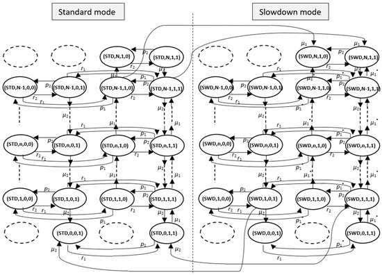 Figure 3 illustrates the state transition diagram of the two-machine production system under the Slowdown Policy (SP), detailing all possible states and transitions between the Standard (STD) and the Slowdown (SWD) operation Modes. Each state is represented by the quadruple (mode, n, α1, α2), where n is the buffer level, and α1, α2 indicate the operational status of machines M1; and M2;. The left side corresponds to STD mode, where M1; operates at its normal speed μ1, while the right side represents SWD mode, where M1; slows down to μ1* when the buffer is full (n = N). The system transitions between these states based on machine operations, failures, and repairs, with mode switching occurring when the buffer reaches its capacity limits: switching to SWD mode when full (n = N) and reverting to STD mode when empty (n = 0).