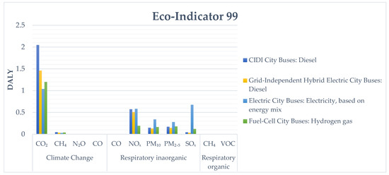 Impact assessment using the Eco-indicator 99 method for each bus technology in the investigated case.