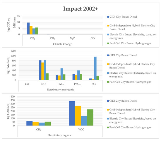 Furthermore, Impact 2002+ also refines the analysis by separating respiratory effects into inorganic and organic emissions and adding climate change impacts. It also provides a more explicit assessment of pollutants, further specifying the air quality-related health impacts. The results confirm the trends from the other methods, emphasizing that fuel cell buses are most preferable in minimizing GHG emissions and pollutant exposure. However, Impact 2002+ also stresses that the benefit of electric buses is closely proportional to the local energy mix, implying that their benefits would be maximized under a transition to renewable energies. Generally, although all approaches highlight the merits of alternative city buses, differences in detail and magnitude exist.