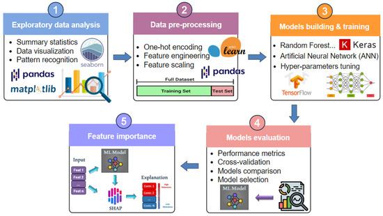 To manipulate the dataset, we made use of python libraries such as numpy 1.21.5 [23] and pandas 1.3.5 [24] that provided tools to manipulate, structure, clean, transform, and analyze the dataset. We used matplotlib 3.5.3 [25] and seaborn 0.12.2 [26] for statistical data visualization. We also used the scikit-learn 1.0.2 library [27], which includes a variety of machine learning algorithms such as linear and logistic regression, decision trees, random forests, etc. We also used this to perform data pre-processing, exploratory data analysis, and train-test splitting, for building and evaluating the machine learning models. We created xgboost 1.6.2 and catboost 1.2.2 regressors using their own libraries [28,29]. Similarly, we also investigated the rfpimp 1.3.7 library [30] to analyze, determine, and visualize the importance of features in a random forest model. This helped to evaluate the contribution of each feature to the model. We also explored the shap 0.41.0 library [31] to interpret the outcome of our models and help in gaining insights into black-box model predictions. We also used the keras 2.10.0 API [32] integrated into tensorflow 2.10.0 framework [33] to create and evaluate neural network models. The experiments were executed on a 64-bit windows PC, equipped with 16 GB of RAM and Intel core i7 with 2.30 GHz frequency.