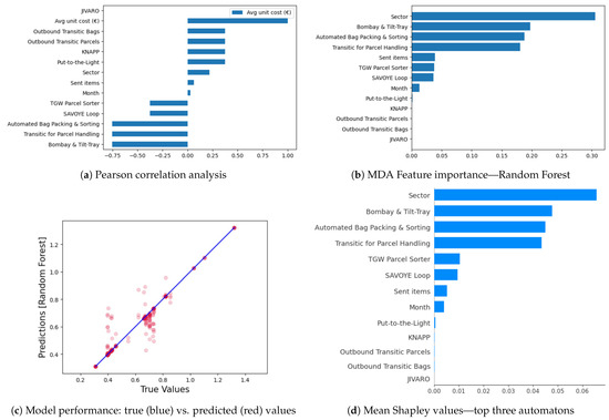 - Model evaluation: We launched the predictions on the test data and then we compared the predictions with the actual values. We selected Root Mean Squared Error (RMSE) as the performance metric to evaluate the models. We noticed that the RandomForestRegressor had the lowest RMSE and performed the best among the models, hence we selected it for our subsequent steps. As seen in Figure 3c, we illustrated the model’s performance by comparing the predicted values with the true one. The blue diagonal line represents perfect predictions, while the red dots represent the actual predictions. Dots on the diagonal indicate correct predictions and scattered dots show prediction errors. We used this model to measure the Mean Decrease in Accuracy in Figure 3b, which depicts the decrease in the model’s accuracy score whenever the related feature was removed. This demonstrates the feature’s importance regarding the decrease in the average unit cost. It is logical to expect that this cost can be greatly impacted by the type of products being handled in each sector. In each sector, we have varying products requirements, handling complexities, and storage needs, which can affect the overall operations cost. Larger or heavier products may require specialized automatons or additional handling efforts, which can increase the cost per unit compared to smaller and lighter items within each sector. Figure 3b shows that this cost was also influenced by three logistics automatons: (n°1) Bombay & Tilt-Tray, (n°2) Automated Bag Packing & Sorting, and (n°3) Transitic for Parcel Handling.