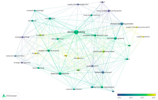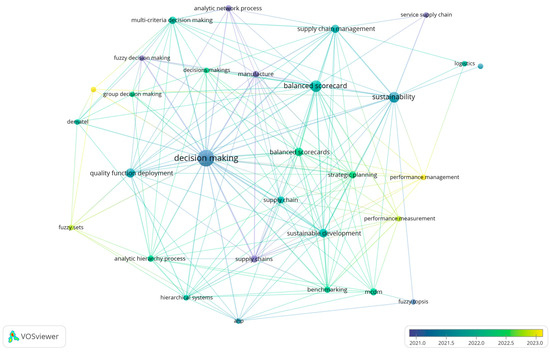 Overlay visualization by VOSviewer from the research results of keywords: QFD AND BSC AND logistics AND strategy. From the 15 years preceding the last 5 years (on the 27 November 2024). Minimum number of occurrences: 4. Source: own compilation.